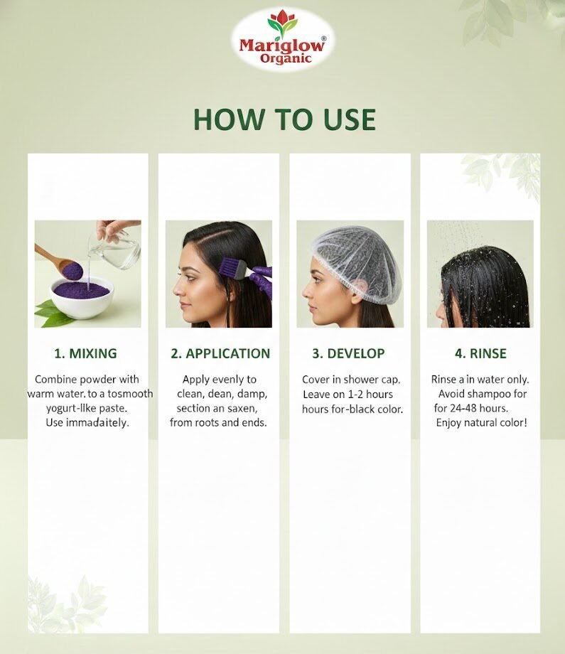 - Mariglow Organic Indigo Powder is 100% natural and organic which doesn’t contain any preservatives so it is suitable for all type hair.